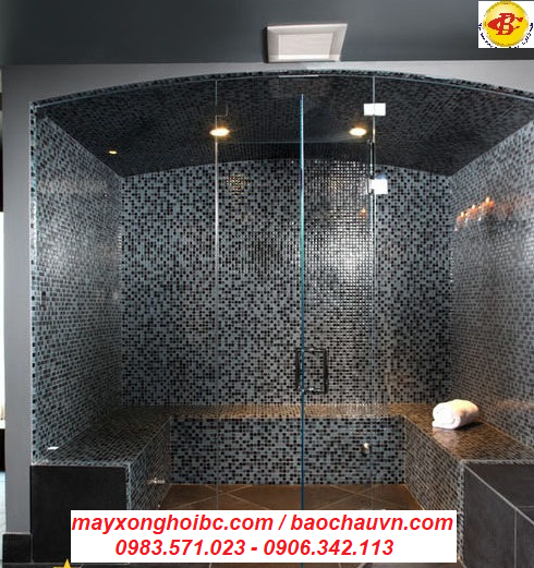 Phòng xông hơi ướt BC01 được Bảo Châu cung cấp và lắp đặt, vách tường được ốp lát bằng gạch mosaic, mặt trước được gắn kính cường lực 10mm