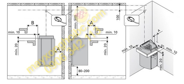 Bảng vẽ kích thước chi tiết cách lắp đặt máy xông hơi khô Sawo 6kw Model: CSA-60