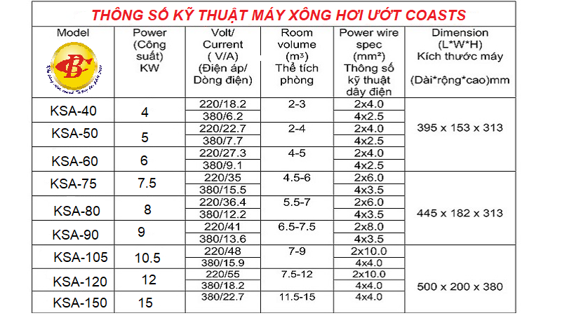 Thông số kỹ thuật máy xông hơi ướt Coasts: